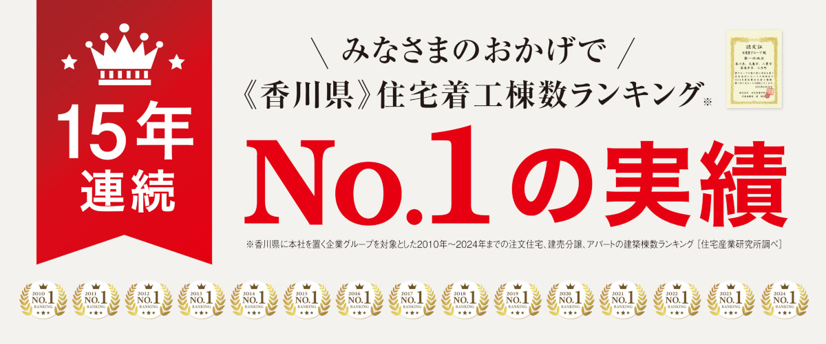香川・岡山で注文住宅を手掛ける日進堂は、みなさまのおかげで香川県住宅着工棟数ランキング15年連続No.1の実績を誇ります。
