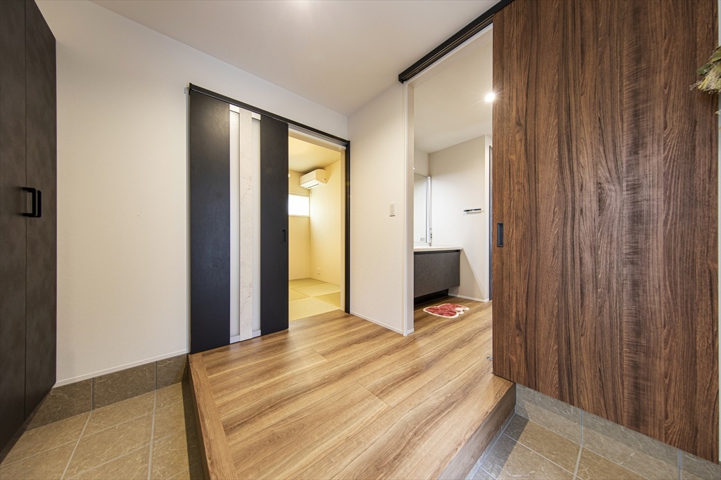 玄関から上がると洗面台に直行して手洗い。「帰ったら手洗い」の習慣が自然と身につきます。広い玄関ホールは忙しい朝でも混雑せずに済みそう。