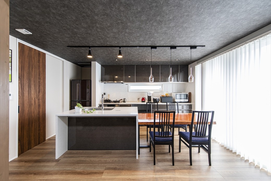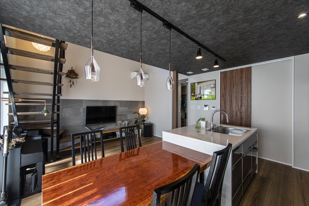 おしゃれなペンダントライトが食卓を照らすダイニングキッチン。白いワークトップが空間をより広く見せます。キッチンの隣のドアを開ければ脱衣室。水回りがコンパクトにまとまり、家事動線も短くラクラク。