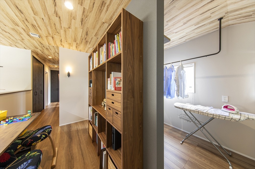 室内物干しに近い廊下のワークスペースは子ども用。宿題なども声の届くところでできて、気配がわかるので安心です。