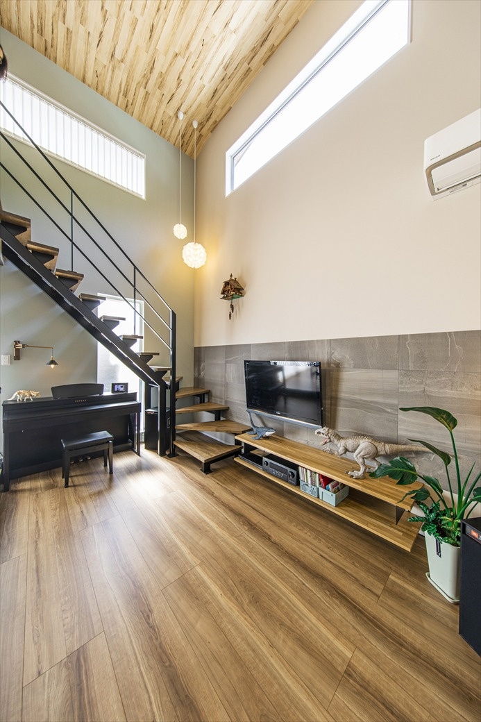 吹き抜けの高窓から光が降り注ぐ明るいリビング。壁の鳩時計もご夫婦のお気に入り。