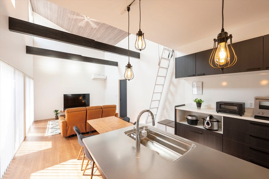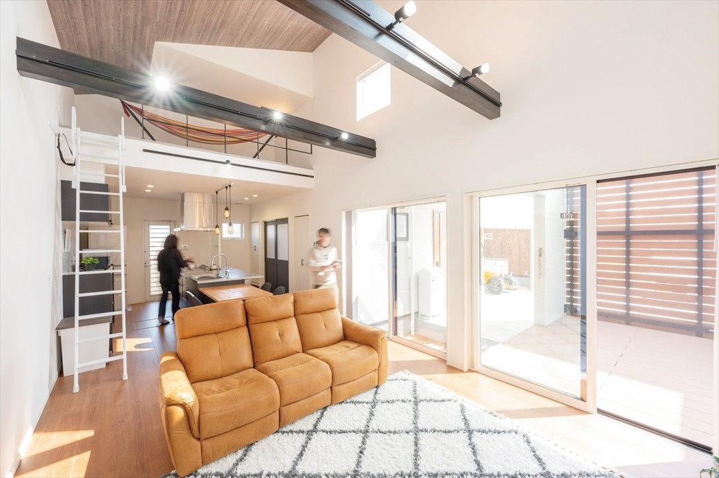 ロフトやウッドデッキ、ガレージがゆるやかに繋がるLDK。勾配天井で縦の広がり、大開口で横の広がりを作り、平屋ならではの開放的な空間です。