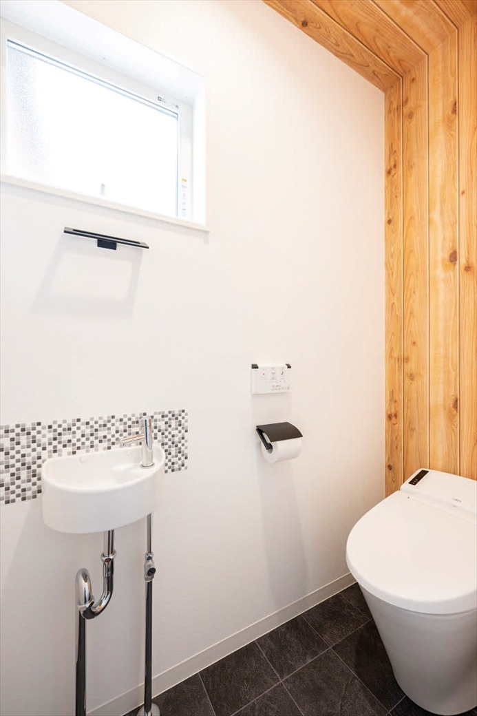 木目×白のスッキリとしたトイレ。水はね防止のタイルはご主人のDIY。