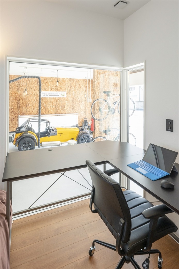 愛車との生活を存分に楽しめるご主人の部屋。L字のガラス窓が、視野の広がりと効率のいい採光を実現。
