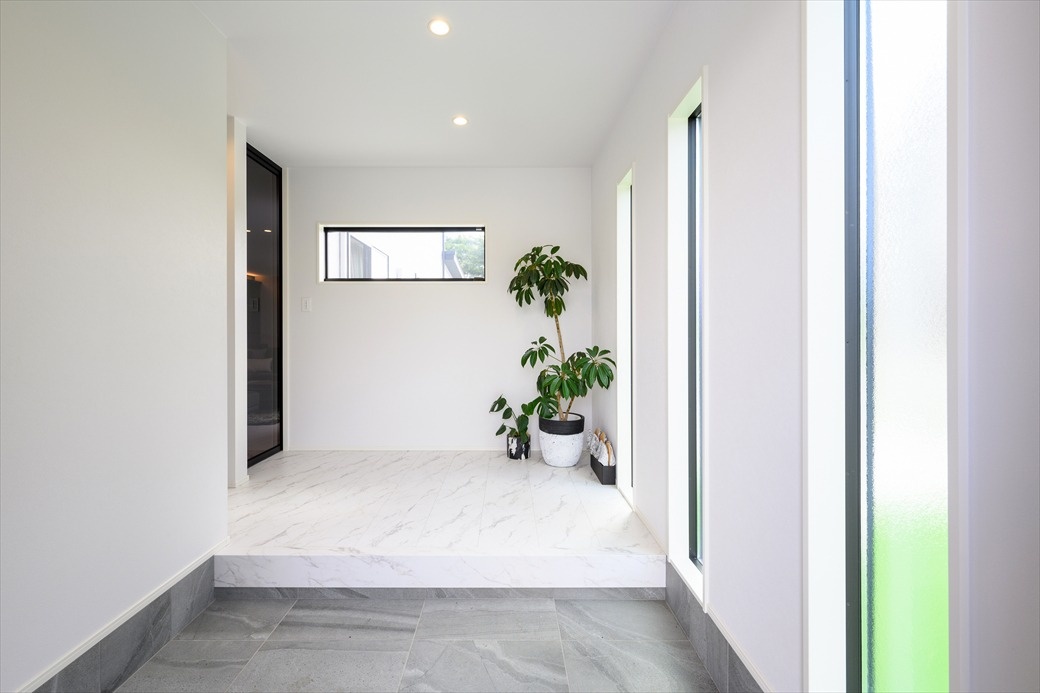 自然光がたっぷりと注ぐ明るい玄関。大理石風のフロアが高級感を感じさせます。2階のプライベートルームに続く階段もここから。