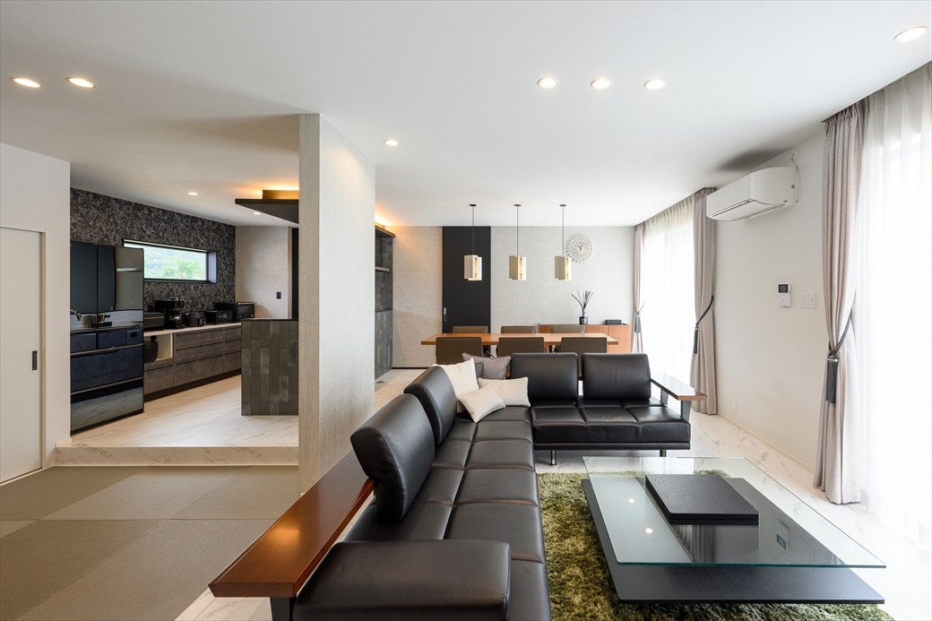 リビングは家族みんなが座れる大きなソファが主役。スキップフロア風の和室は娘さんのお気に入りスペースになっています。