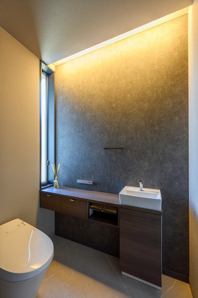 トイレの明かりは間接照明のみ。シックなデザインで落ち着いた空間に仕上げています。