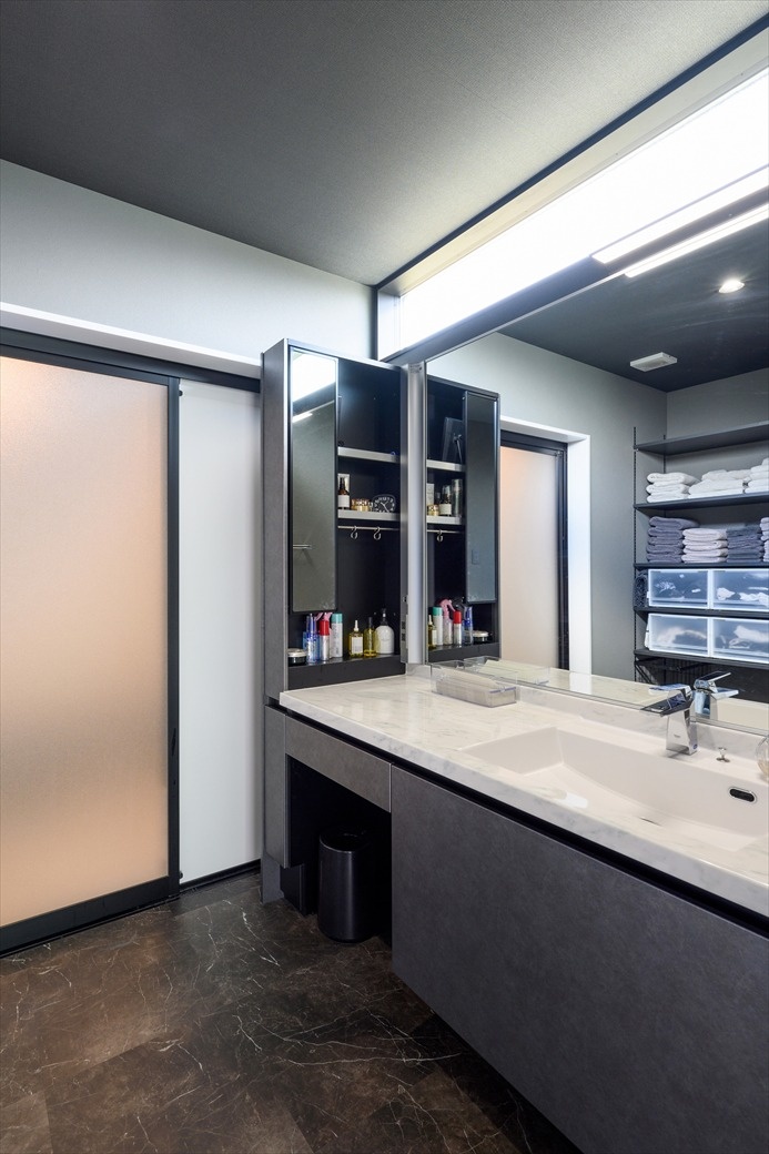 ホテルライクな洗面脱衣室。水回りをすべてフロアタイルで統一したのもご夫婦のこだわり。