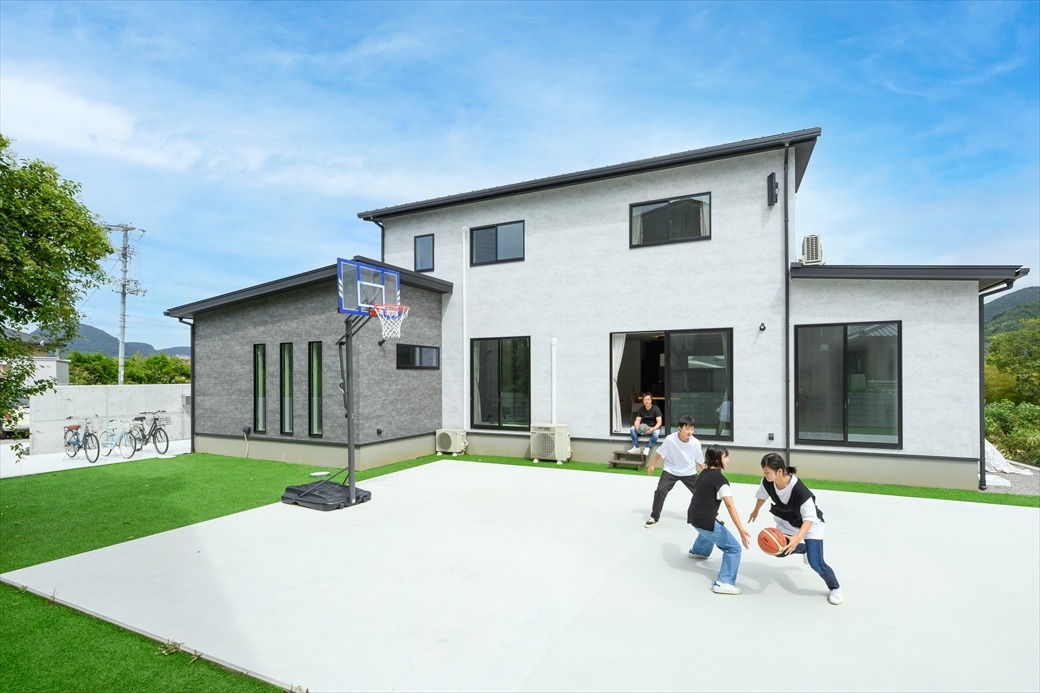 庭のコートでバスケットボールを楽しむお子さんたち。広い敷地ならではのゾーニングです。