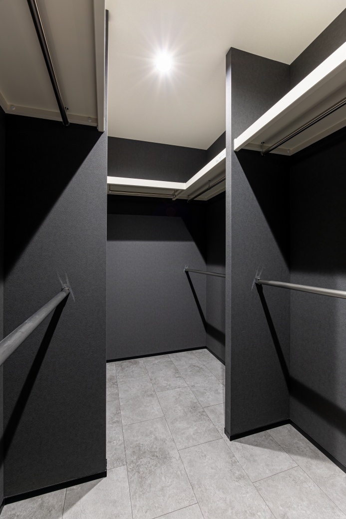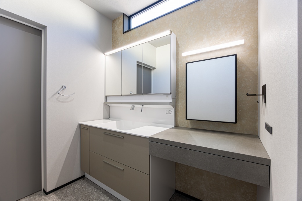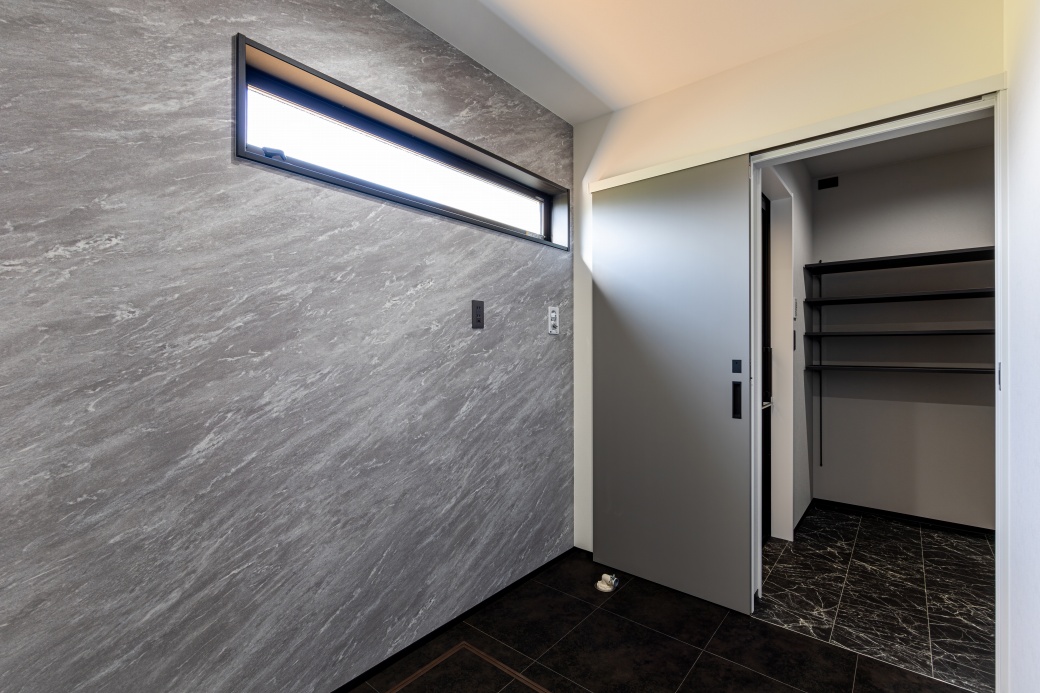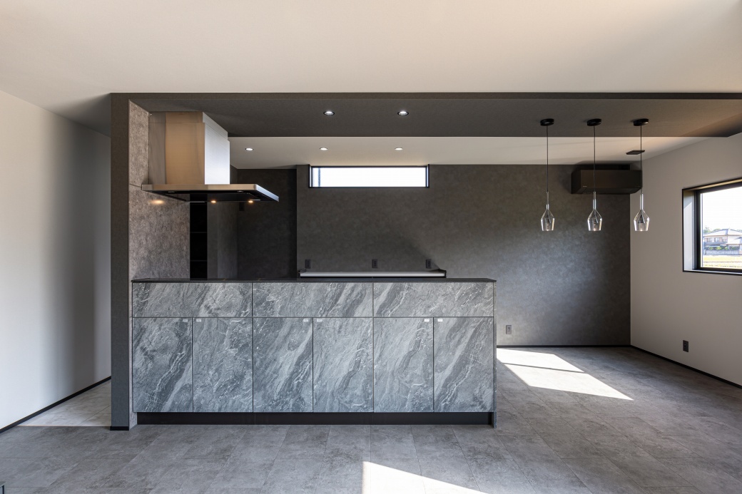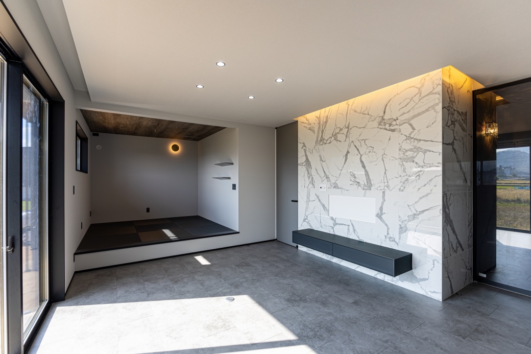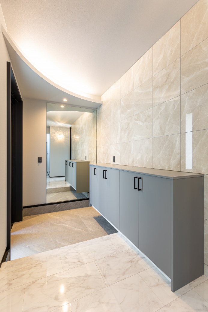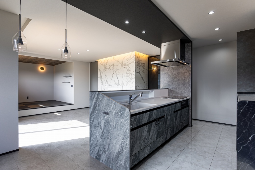 ホーム 家を建てる 施工事例 憧れのラグジュアリー 善通寺市憧れのラグジュアリーホテルのような家 36~40坪 3LDK 2階建て 外観:黒系 家事室 洗面収納 リビングクローク ホテルライク LDK グレートーンでまとめた空間に、テレビ背面には鏡面仕上げの大判タイルと間接照明を採用したラグジュアリーな室内。 畳コーナー リビング横にある小上がりの畳コーナーが、家族や友人とゆったり集う憩いの場として活躍します。 キッチン 石目調のキッチンにブラックの折り下げ天井が調和した、重厚感ある落ち着いた空間。背面の高窓から自然光を取り込み、ほどよい明るさをプラスしています。 玄関 明るいトーンの鏡面タイルと曲線の折り上げ天井が印象的な玄関。奥行きを映す姿見が広がりを生み、ワンランク上のホテルライクな設えとなっています。 洗面室 洗面台の隣には、座ってゆっくりメイクやスキンケアなどを行えるカウンターと鏡を設置。 トイレ ブラックの鏡面タイルと床材、トイレットペーパーホルダー上部の棚を石目調で統一した洗練された空間。 ランドリールーム ファミリークローゼット リビングにもランドリールームにもつながる3.5帖のファミリークローゼット。洗濯動線をコンパクトにまとめ、外出前の準備もスムーズに行える便利な間取りです。 36~40坪 3LDK 2階建て 外観:黒系 家事室 洗面収納 リビングクローク ホテルライク おすすめのタグから探す 平屋 インナーガレージ 3LDK 30~35坪 和モダン 屋上 2階建て 南欧 パントリー 二世帯住宅 勾配天井 吹抜 人気のタグ 家事室 スキップフロア シューズクローク 書斎 中庭 ロフト すべてのタグから探す