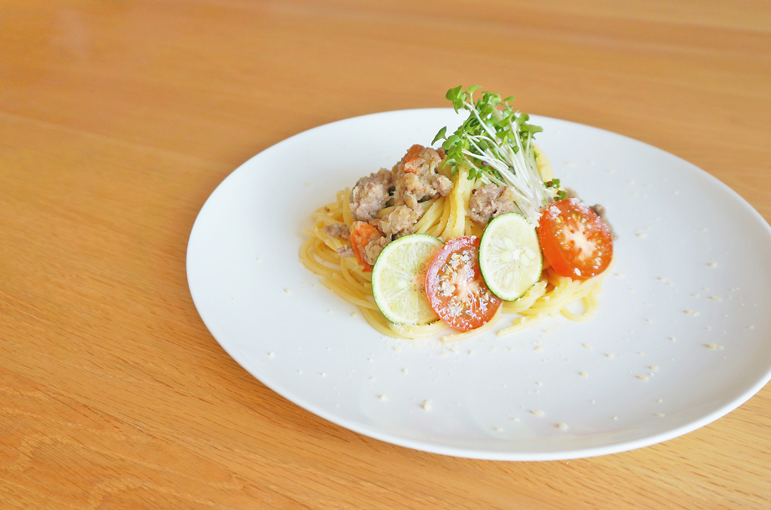 ⑦皿にパスタを盛り付けて上から粉チーズをふりかけ、お好みでスプラウト、スライスしたすだちやミニトマトを飾り付けて完成。
